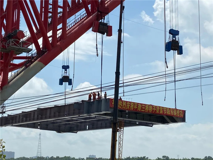 7月4日上午,由中國船舶武船集團(tuán)武船重工股份承建的世界第一大跨度鋼管拱橋――平南三橋再次迎來關(guān)鍵節(jié)點(diǎn),格子梁首節(jié)段(北岸PHL04N)精準(zhǔn)落位,吊裝成功,線型和標(biāo)高全部滿足設(shè)計(jì)規(guī)范要求,標(biāo)志著大橋正式進(jìn)入橋面梁施工階段。