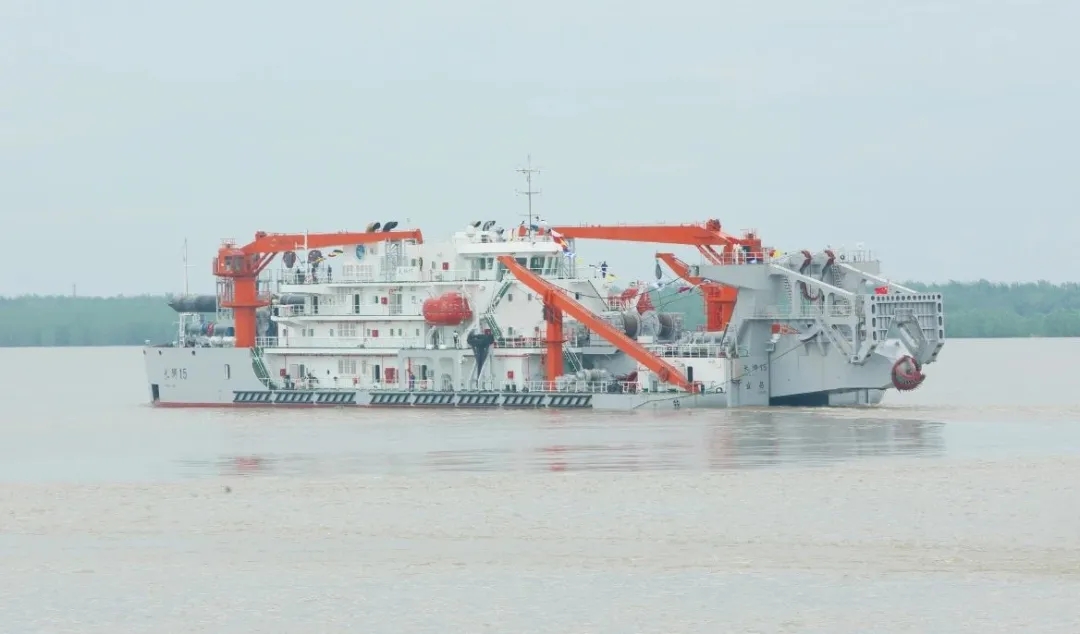 2000方挖泥船“長獅15”是武船集團為長江航道局建造的第三艘2000方挖泥船,總長93.1米,型寬23米,設計吃水3.4米,排水量約5700噸。該船在航行推進、挖泥疏浚、鉸刀、絞車封水等系統廣泛應用變頻技術,使船舶控制較母型船更加靈活,效率更高,更環保節能。該船泥泵主機采用橫扭距功率輸出,使施工效率大幅提高,疏浚產量能從2000方/小時,提升到2600方/小時。