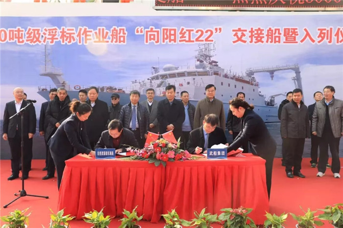 12月3日,由中國船舶武船集團建造的我國首艘3000噸級大型浮標工作船“向陽紅22”在上海順利交付。自然資源部海洋預警監測司副司長王華,武船集團黨委書記、董事長陳?街麓牽?自然資源部東海局局長吳強宣布該船入列并向船長授旗,武船集團副總經理王渭齡主持交付儀式。