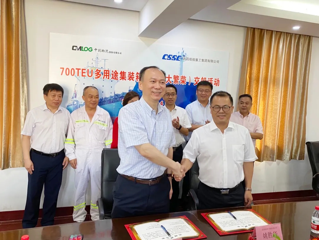 8月4日8時18分,由中國船舶武船集團為中創物流青島遠大均勝海運有限公司建造的700TEU多用途集裝箱首制船(遠大繁榮),在江蘇南通順利交付。中創物流青島遠大均勝海運有限公司董事長高兵、上海船舶研究設計院副院長周志勇、武船集團副總經理姚勝華出席了交船活動。