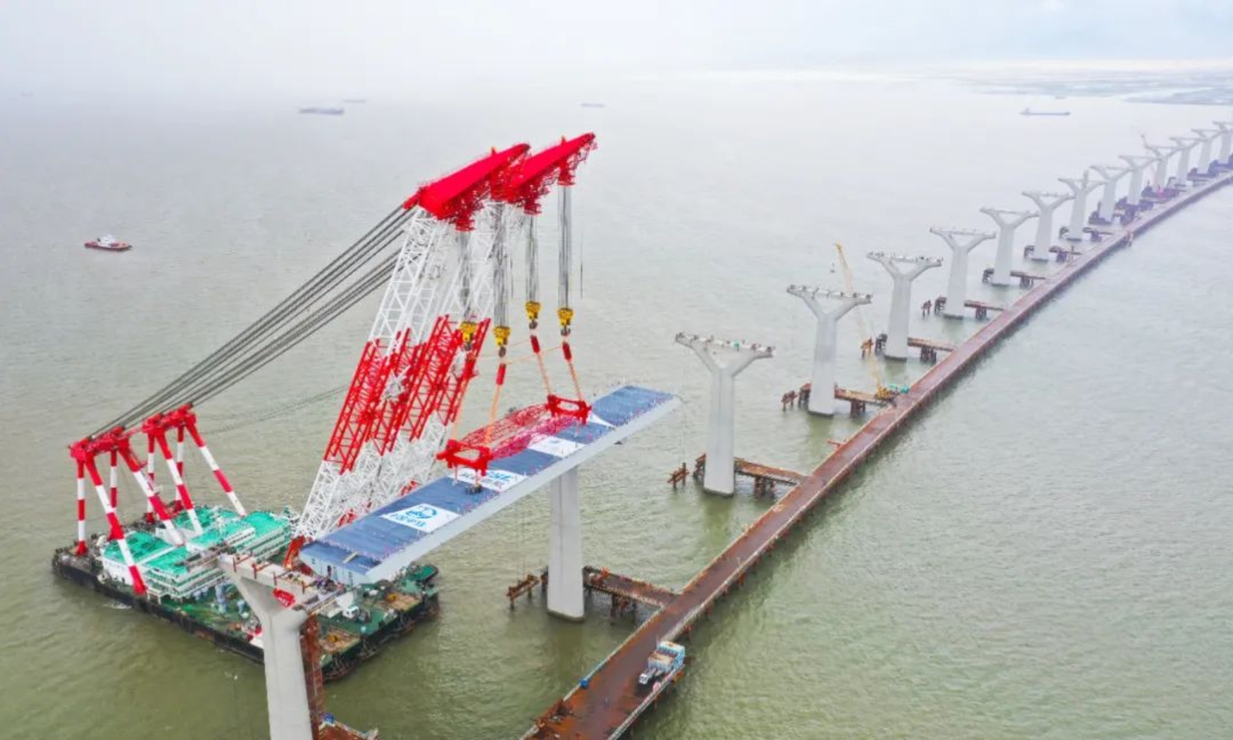 8月12日下午14時,黃茅海跨海通道中引橋施工現場,重達1340噸鋼箱梁大節段成功吊裝,標志著黃茅海跨海通道中引橋鋼箱梁大節段吊裝作業全面開始。