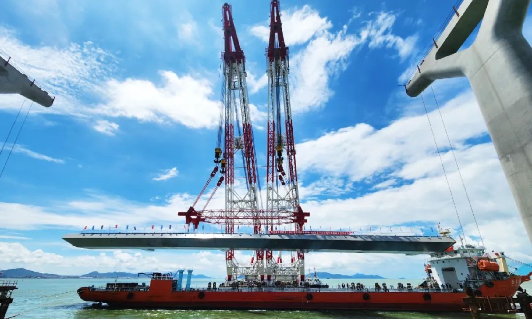 中國船舶集團武昌造船重工公司承接的黃茅海跨海通道G2合同段中引橋為為1600米鋼箱連續梁橋,左右幅分離,鋼箱梁大節段共32節,現場采用半幅大節段吊裝方式進行吊裝。本次吊裝的大節段長123米、寬18.75米、高4米、重1340噸,是全橋最大、最長、最重的6節大節段之一。
