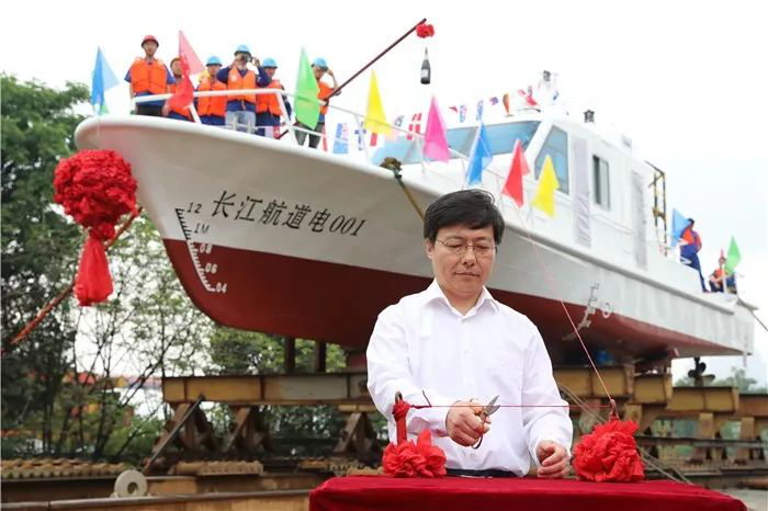 長江航務管理局副局長魏志剛,長江航道局副局長王建斌,中車永濟電機有限公司副總經理郭永安,西安中車永電電氣有限公司總經理王慶軍,中國船級社武漢分社建造處處長葉寧,武昌船舶重工集團有限公司副總經理王渭齡為“長江航道電001”下水剪彩。郭永安行“擲瓶禮”。